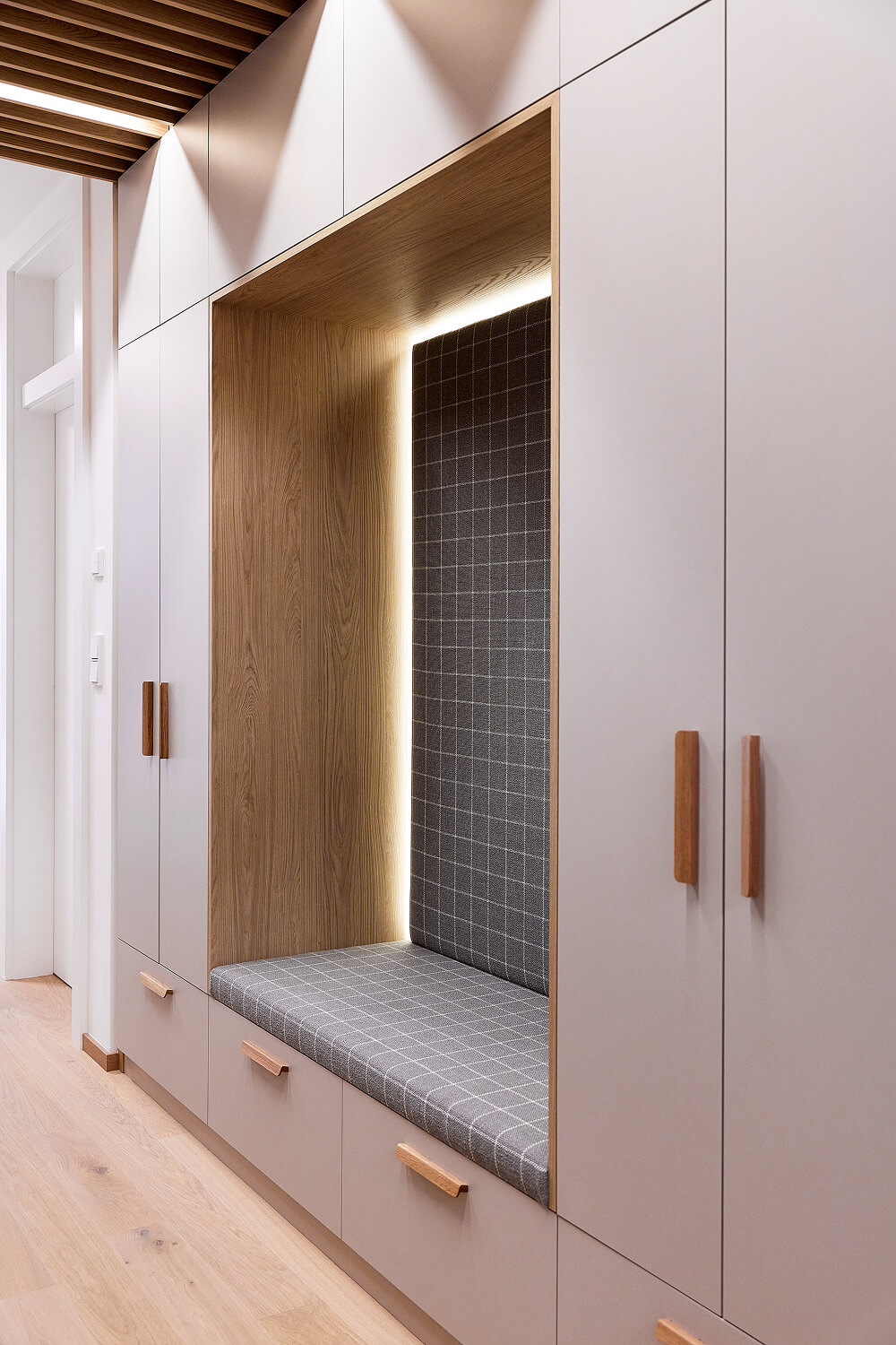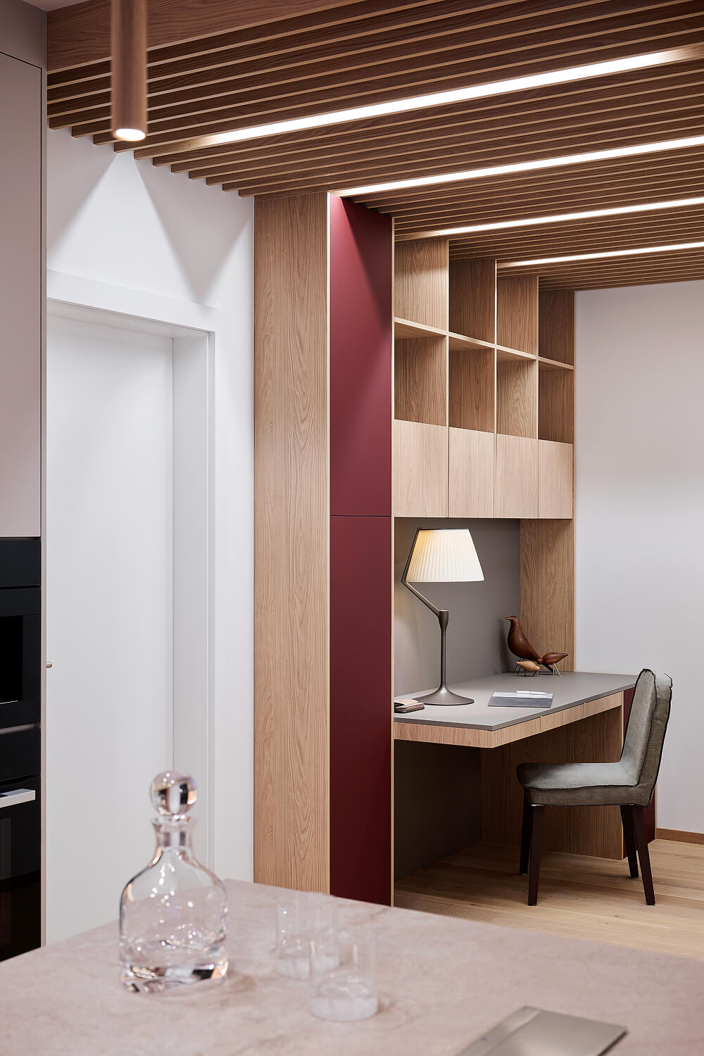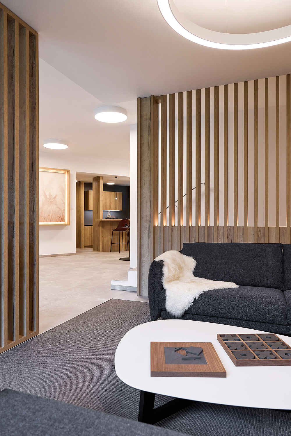 Každý prostor byl navržen individuálně, s důrazem na detail a funkčnost, přičemž zůstává patrná jednotná estetická linie. Stylové doplňky, akcentní svítidla a umělecká díla vnášejí do interiéru osobitý charakter, zatímco pečlivě zvolená materiálová paleta a práce se světlem podtrhují architektonickou logiku celého řešení.