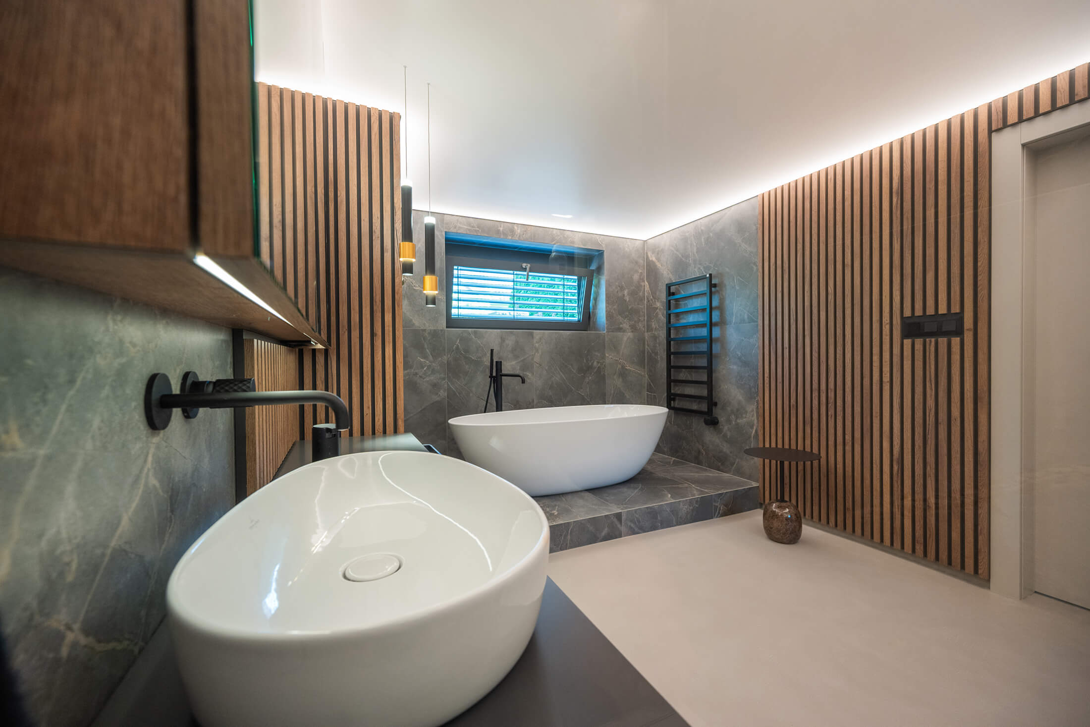 Koupelna navazuje na styl celého interiéru – dominuje jí přírodní kámen, dřevěné lamely, černé baterie a volně stojící vana, které podtrhují luxusní, ale útulnou atmosféru.